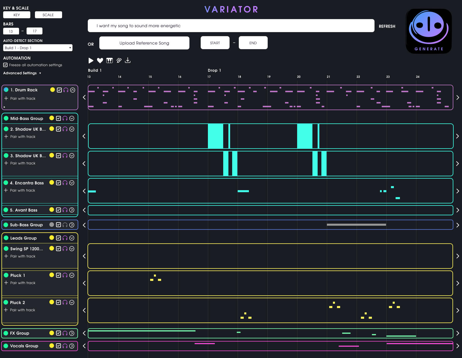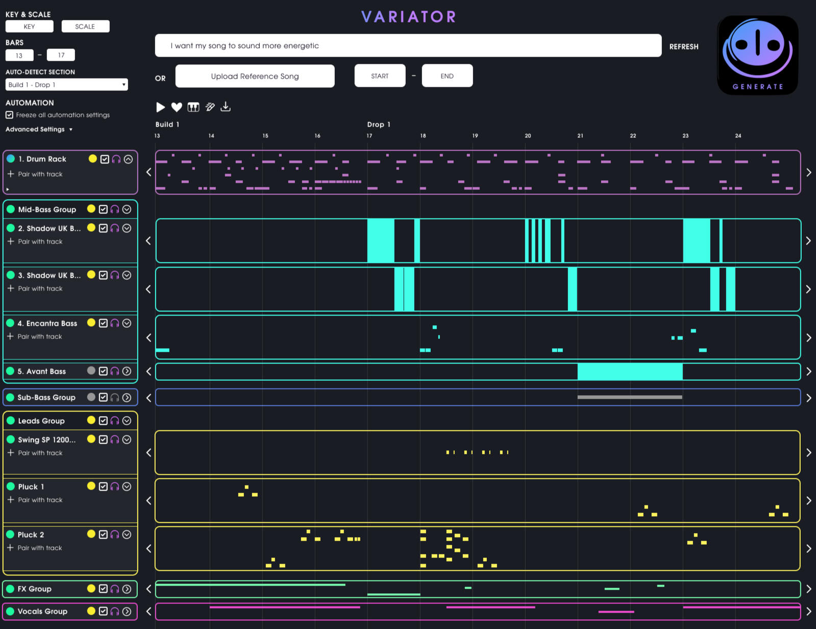 The Variator Plugin is an AI-powered tool that enables music producers to randomly generate alternative compositions of songs created in digital audio workstations. It allows users to experiment with their sound design, offering variations that can inspire creativity or be directly utilized in their projects.This plugin enhances a music producer's workflow by analyzing and rearranging tracks in a DAW. By leveraging AI, it provides alternative arrangements, allowing the user to adjust parameters such as danceability, genre, and mood. The system will generate new MIDI sequences and audio patterns, optimizing the music's flow and coherence across all tracks.The Variator "listens" to the user’s musical elements and track arrangements to generate alternative rhythms for a selected section of a song. By analyzing the musical data based on the user’s criteria, it provides alternative clip arrangements for each track while preserving the overall cohesiveness of the sound. These criteria are automatically determined by the song’s key elements, such as rhythm, genre, and energy level, to ensure the generated rhythms are aligned with the original piece. Additionally, users can manually input specific criteria, such as the desired genre, artistic style, or sentiment. Users can also upload a reference song from their desktop. The Variator will then generate clip arrangement suggestions using the user’s audio samples, instruments, and synthesizers, allowing them to explore different compositions of their original sound design. Users can import these tracks into their projects without altering the sound design or quality, and also export compositions as audio files to their desktop for future inspiration.